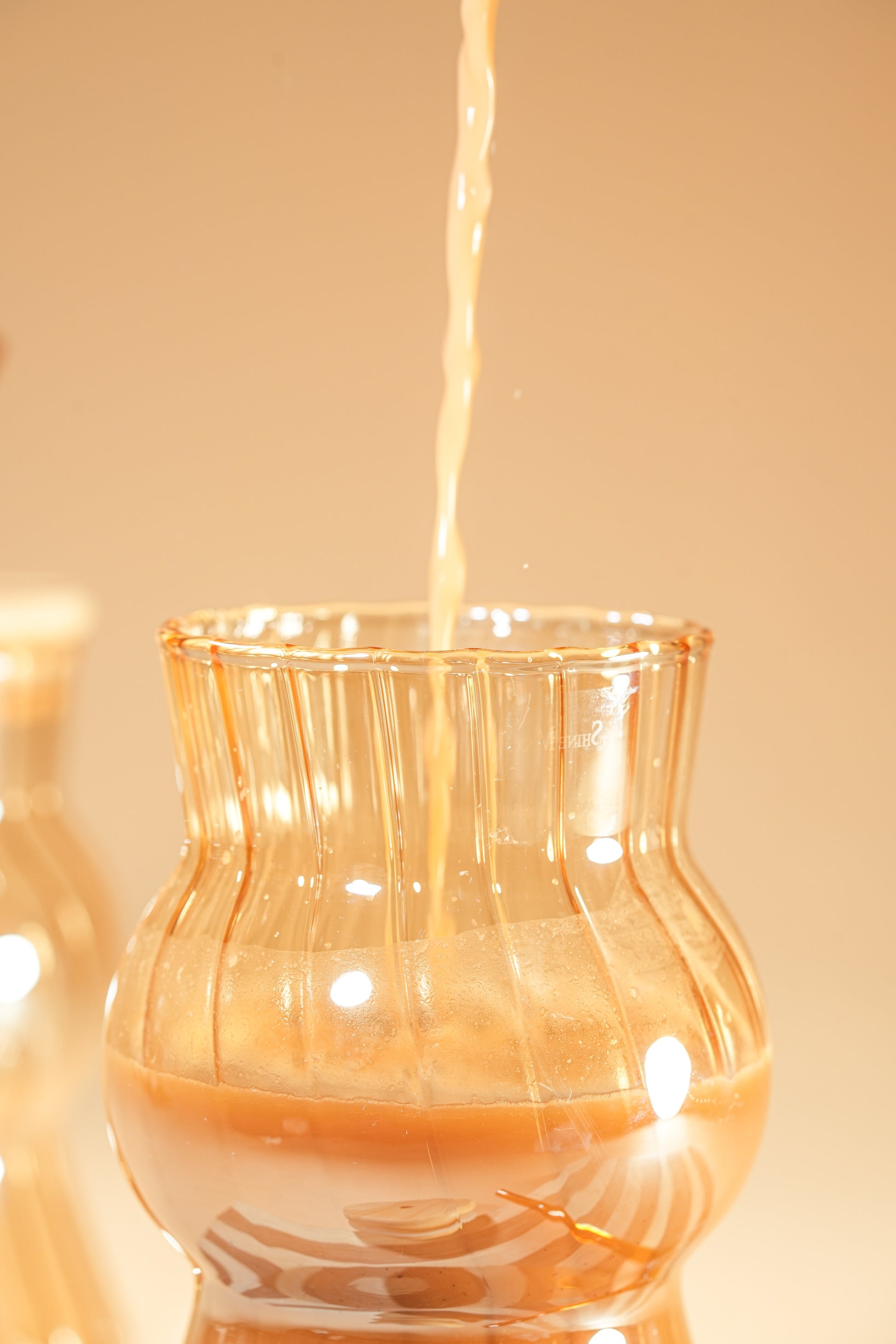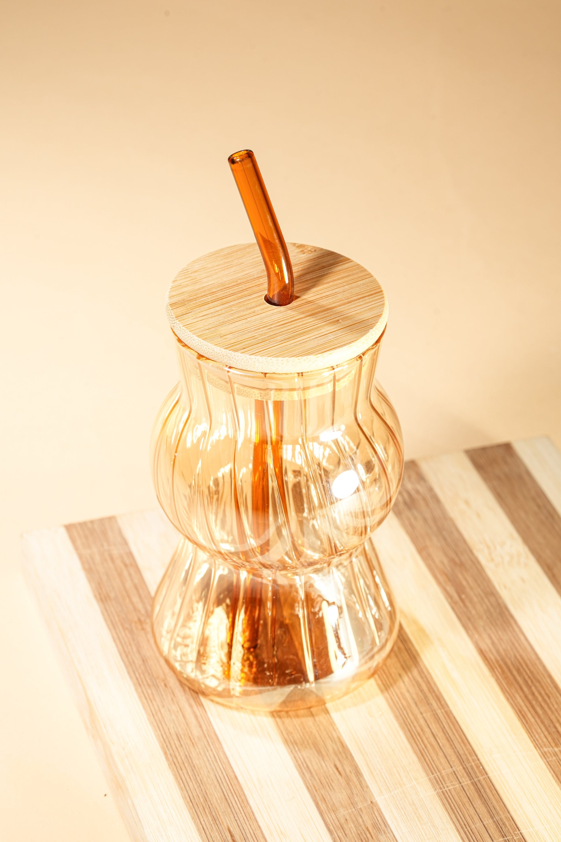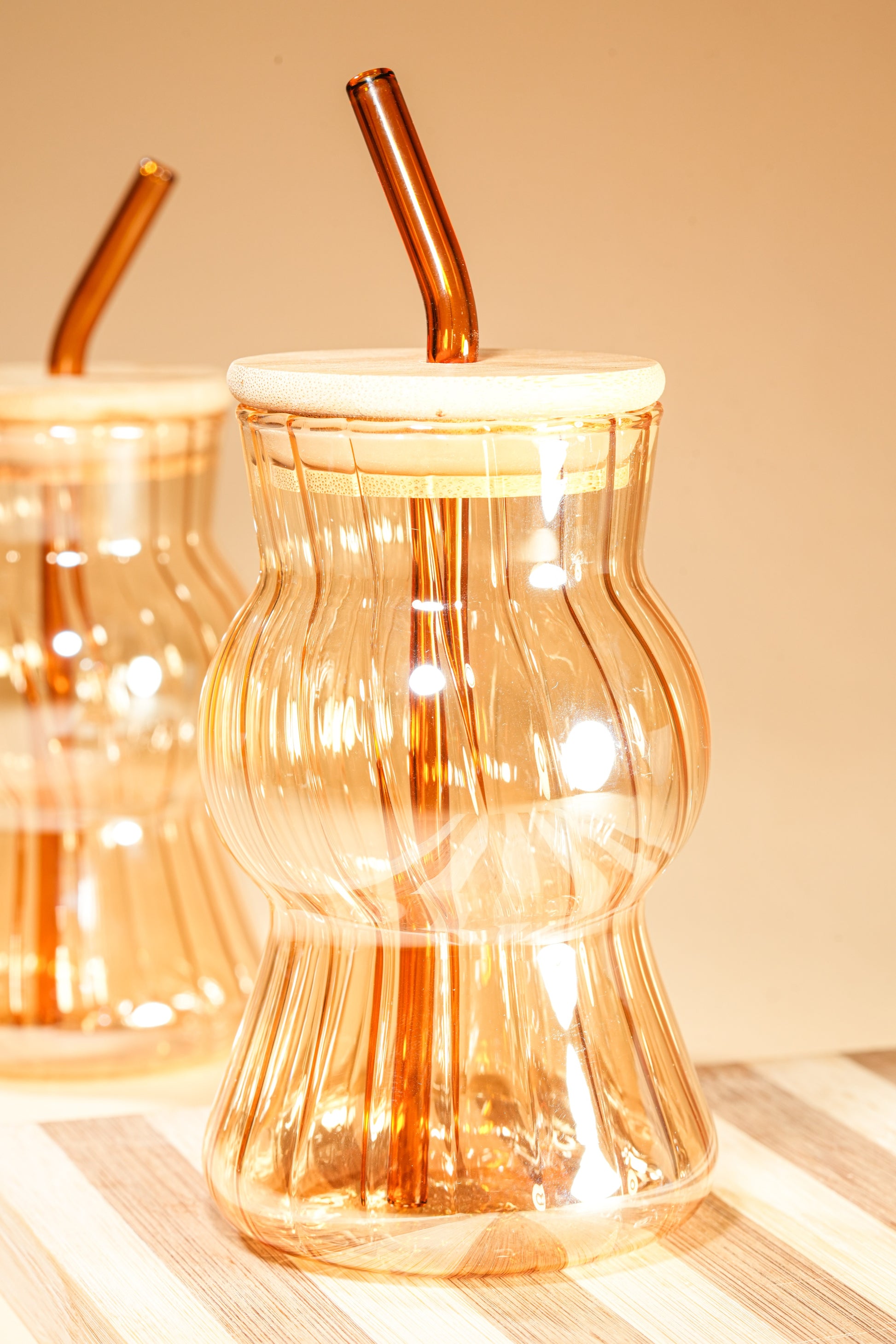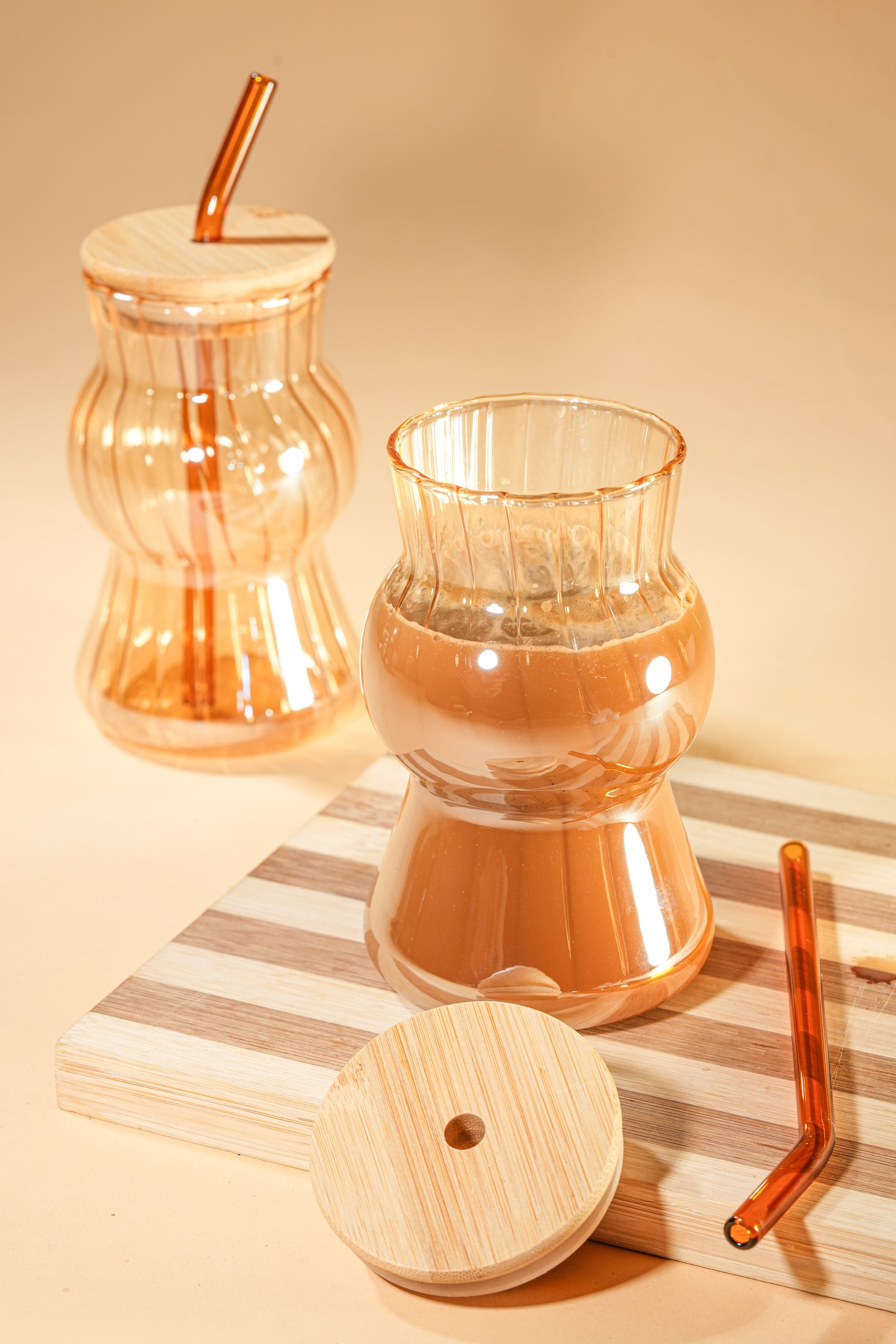 Amber Wave Glass Tumbler with Wooden Lid & Glass Straw Set of 2 (480ml)